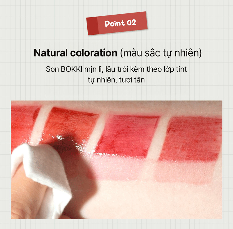 Thêm vào đó, son Black Rouge Glow Bokki Tint có độ dưỡng tốt, giúp bạn không bị khô môi quá nhiều trong quá trình sử dụng. Khi thoa lên môi, son tạo độ bóng cao, sau khoảng 30 giây son sẽ set vào môi tạo độ lì. Son có độ bám màu từ 4-6 tiếng khi không ăn, khi trôi sẽ để lại lớp base nhẹ nhàng, tự nhiên, không làm lộ màu môi thật quá nhiều.